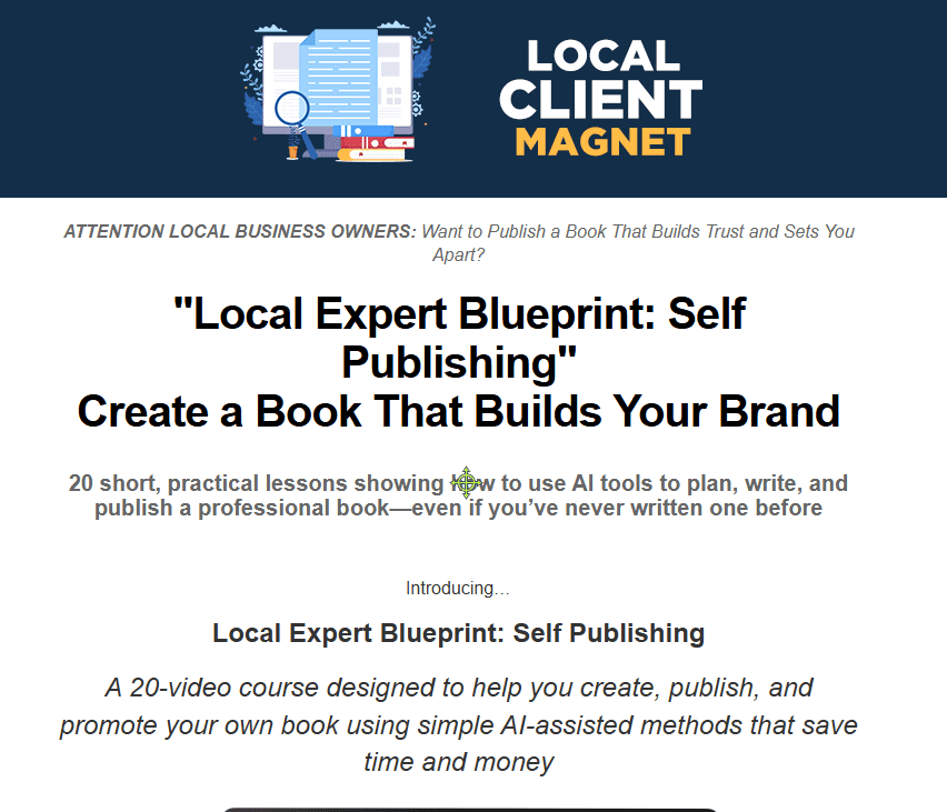 A complete, done-for-you Local Client Magnet: AI Self-Publishing curriculum pack you can brand, publish, and use to book consults fast.