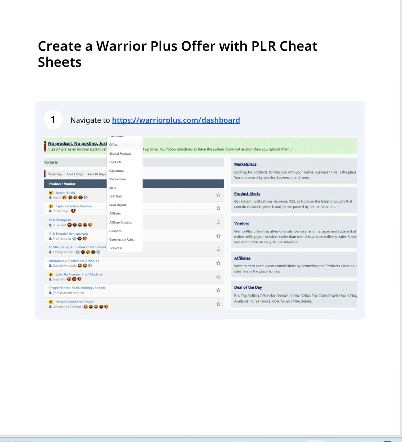 This is not just another video course. This is a comprehensive collection of Step Documents—Standard Operating Procedures (SOPs)—that visually demonstrate exactly how to navigate the Warrior Plus platform.